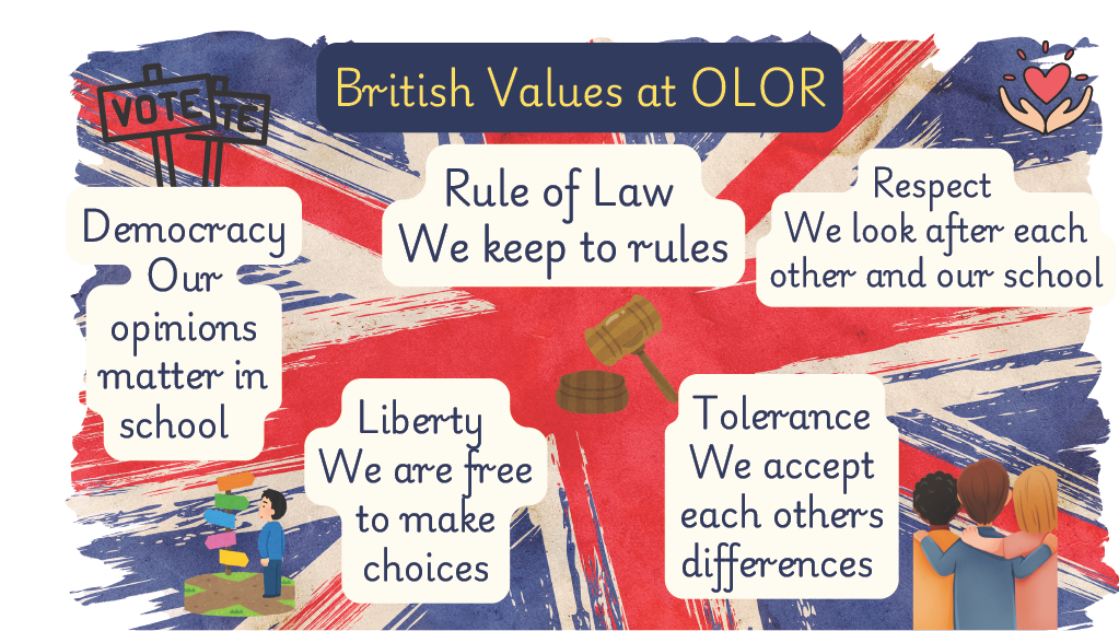 As a Voluntary Aided Catholic Primary School, we promote Christian and British values through our curriculum, extra-curricular activities, teaching and learning. We ensure all learners understand the values that have traditionally underpinned British society, preparing pupils for life in England's increasingly diverse society.